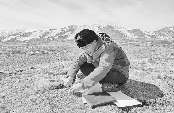 趙新全在青海省海南藏族自治州貴德縣采集牧草樣品(2020年2月29日手機拍攝)。新華社發(fā)