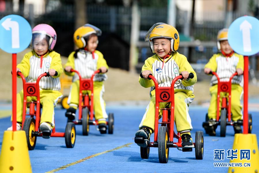 11月30日,浙江省湖州市長(zhǎng)興縣龍山幼兒園的孩子們?cè)谧觥鞍踩T行”游戲。新華社發(fā)(譚云俸 攝)