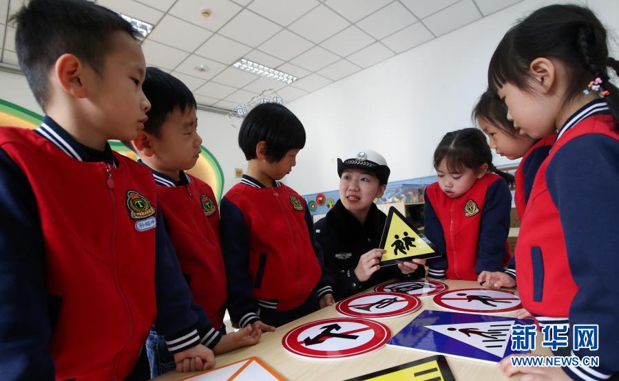11月30日,交警在位于濟(jì)南市的山東省實(shí)驗(yàn)幼兒園南校區(qū)指導(dǎo)孩子們識(shí)別交通安全標(biāo)識(shí)牌。新華社發(fā)(郝群英 攝)