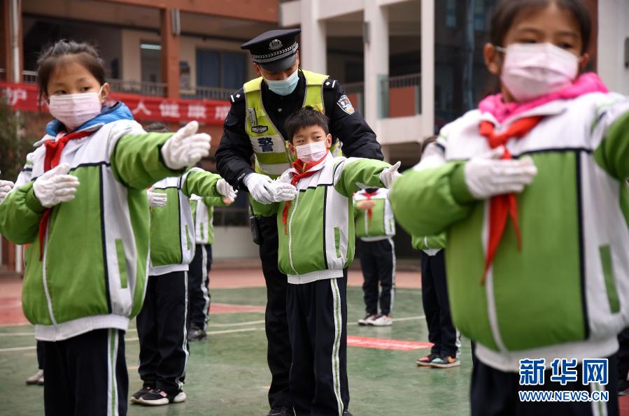 11月30日,河北省邯鄲市公安局交巡警支隊(duì)叢臺(tái)一大隊(duì)的民警在指導(dǎo)叢臺(tái)小學(xué)的學(xué)生們學(xué)習(xí)交通指揮手勢(shì)。新華社發(fā)(郝群英 攝)
