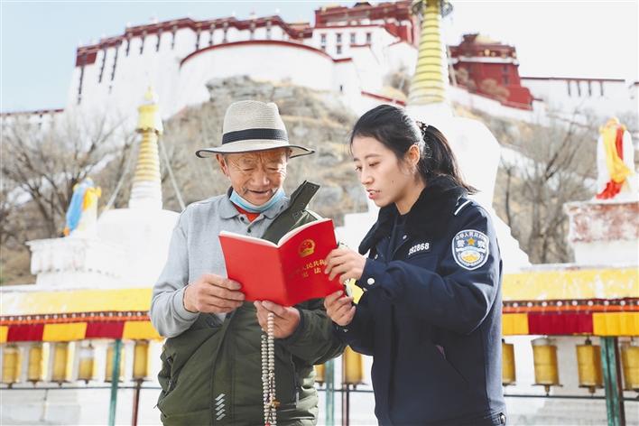 圖為西藏出入境邊防檢查總站執(zhí)法調(diào)查支隊(duì)民警在宗角祿康公園向過往群眾宣傳憲法知識(shí)。仁青旺堆 張一鳴 攝