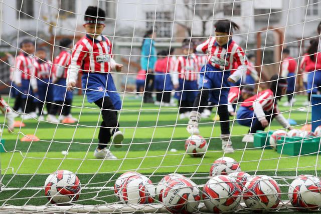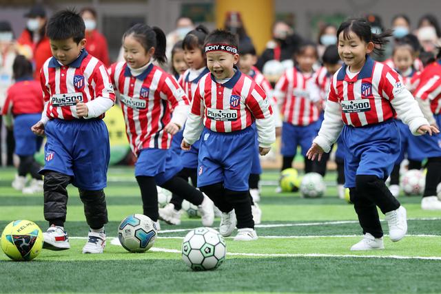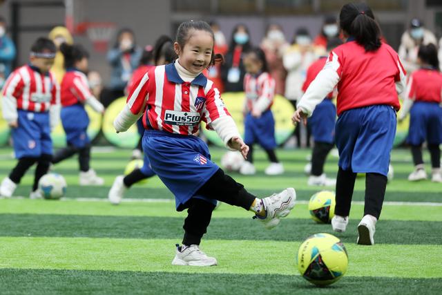 12月7日,淮北市第二實驗幼兒園的小朋友在足球課上學(xué)習(xí)踢足球。