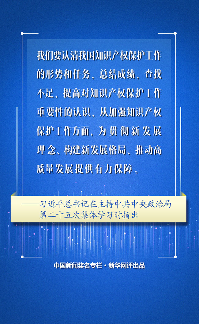 近日,中共中央政治局就加強(qiáng)我國(guó)知識(shí)產(chǎn)權(quán)保護(hù)工作舉行第二十五次集體學(xué)習(xí),習(xí)近平總書(shū)記在主持學(xué)習(xí)時(shí)發(fā)表重要講話,回顧總結(jié)我國(guó)知識(shí)產(chǎn)權(quán)保護(hù)工作取得的歷史性成就,深刻闡述知識(shí)產(chǎn)權(quán)保護(hù)工作的重要性,對(duì)全面加強(qiáng)知識(shí)產(chǎn)權(quán)保護(hù)工作提供了明確思路和行動(dòng)指南。