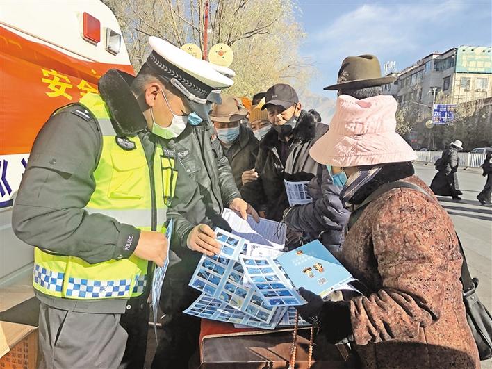 圖為拉薩交警向市民宣傳交通安全知識。婁夢琳 攝
