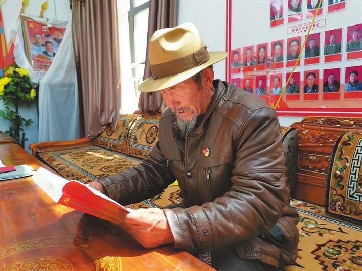 圖為拉孜縣錫欽鄉(xiāng)錫欽村老人阿旺仁增正在閱讀學(xué)習(xí)。記者 扎西頓珠 攝