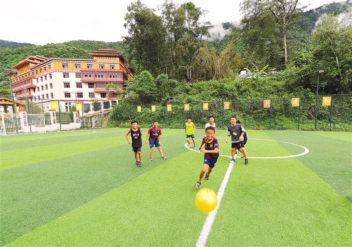 圖為林芝市墨脫縣墨脫鎮(zhèn)墨脫村的孩子們在家附近的足球場上踢足球。格桑吉美