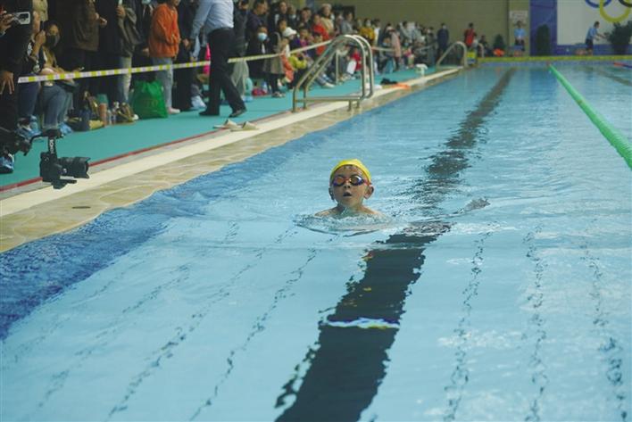 比賽現(xiàn)場,泳池邊一派熱鬧景象,小朋友們摩拳擦掌,舒展筋骨,認真做著熱身運動?!班兀 睒屄曧懫鸬哪且豢蹋x手們一個個猶如離弦之箭在50米的賽道上沖刺,朝著對岸終點勇往直前。選手們?nèi)σ愿?,爭分奪秒,碧水中揚起層層水花,完美展現(xiàn)了參賽選手的風采和游泳運動的魅力。家長們在一旁打氣助威,拍視頻記錄著這一刻,選手奮力朝著對岸游動,永不放棄的精神,感動著觀看比賽的每一個人,賽場頓時暖了起來。