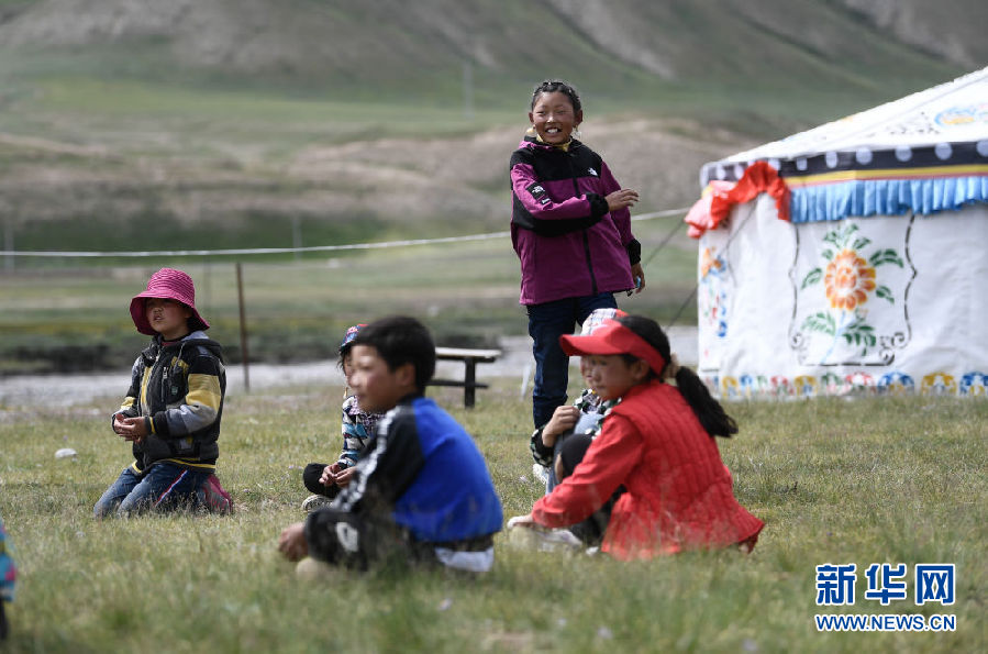 8月2日,在青海省果洛藏族自治州瑪沁縣下大武鄉(xiāng)年扎村的“育苗加油站”,孩子們?cè)谝黄鹜嫠?。新華社記者 張龍 攝