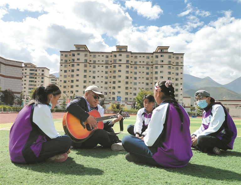 “在古城拉薩有個(gè)愛(ài)我的家,他的名字就叫特殊家……”在特校操場(chǎng)上,一群視障孩子圍著特校盲部的斯勇老師,放聲歌唱。對(duì)于平均年齡十幾歲的盲童來(lái)說(shuō),雖然看不見(jiàn)世界的色彩繽紛,但絲毫不影響他們對(duì)于知識(shí)的渴求和對(duì)世界的好奇,這離不開(kāi)特校老師斯勇手把手的教導(dǎo)。