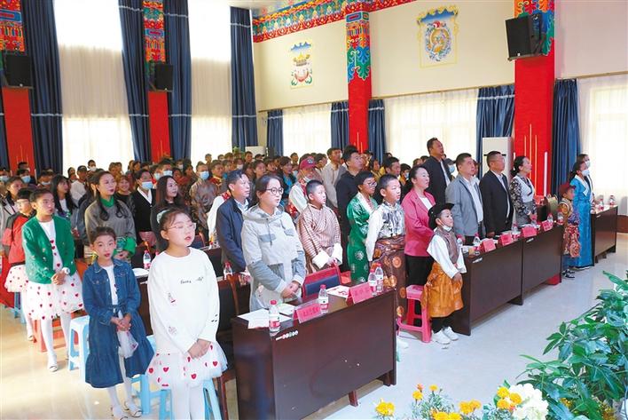 在中國(guó)拉薩SOS兒童村開村20周年慶?;顒?dòng)上,SOS村全體干部職工和孩子們共唱國(guó)歌。