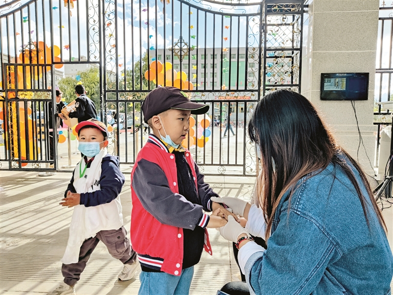 圖為在拉薩江蘇實驗幼兒園門口,老師對入園幼兒進行手部檢查。拉薩融媒記者 余洋洋攝