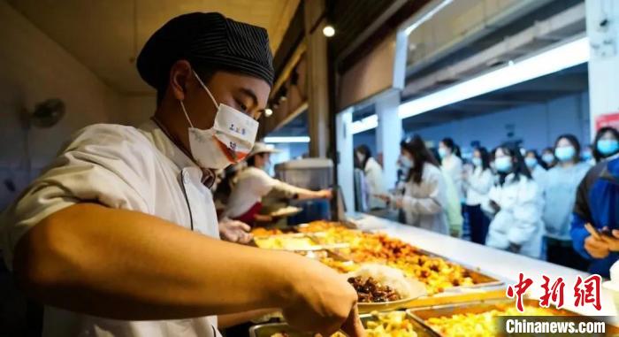 成都銀杏酒店管理學(xué)院學(xué)生志愿者在食堂幫忙?!∷拇ㄊ〗逃龔d供圖