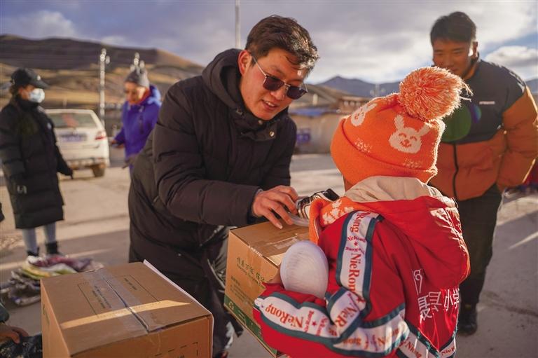 “扎西旺堆,過來領(lǐng)你的足球,還有去老師那邊拿盲盒和毛衣?!碑?dāng)木江鄉(xiāng)初小校長旦增頓珠將孩子們一個個叫過來。在一旁的王順利、申國強(qiáng)負(fù)責(zé)給孩子們發(fā)放心愿禮物,西藏商報(bào)記者、工作人員給孩子們遞上一個個“盲盒”。