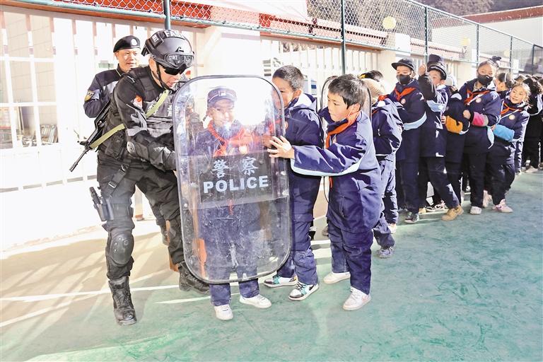 圖為比如縣公安局民警正在為比如縣第三小學五年級的學生講解警用盾牌的使用方法。記者 萬靖 攝