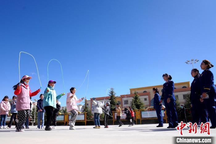圖為志愿者和孩子們開展跳繩游戲?!∈└?攝