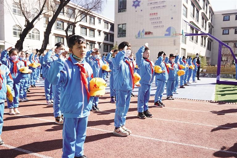 同樣,拉薩市城關(guān)區(qū)第二小學(xué)在開學(xué)第一天,舉行了2022年春季開學(xué)典禮暨創(chuàng)建鑄牢中華民族共同體意識示范學(xué)校啟動儀式。從學(xué)生走入校門,到開學(xué)第一課“剛健有為、自強不息”,再到升國旗儀式,全體師生以嶄新的面貌,飽滿的熱情,積極投入到新學(xué)期的工作學(xué)習(xí)中。