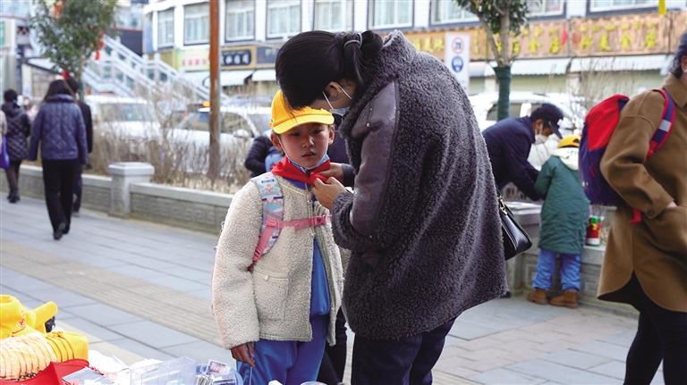 10日早上8時20分許,小學(xué)生們佩戴鮮艷的紅領(lǐng)巾、頭戴小黃帽,陸陸續(xù)續(xù)走進拉薩市第一小學(xué)的校門。今年春季開學(xué)第一天,有些家長蹲在孩子面前,幫忙整理衣帽,同時鼓勵孩子“加油!”。