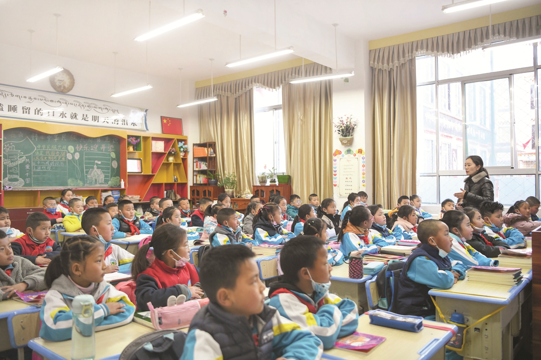 拉薩市城關區(qū)第二小學的同學們聆聽開學第一課