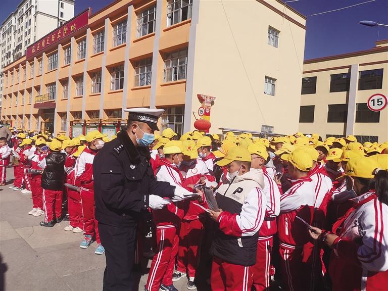 民警給學生發(fā)放交通安全宣傳資料。圖由 拉薩交警 提供
