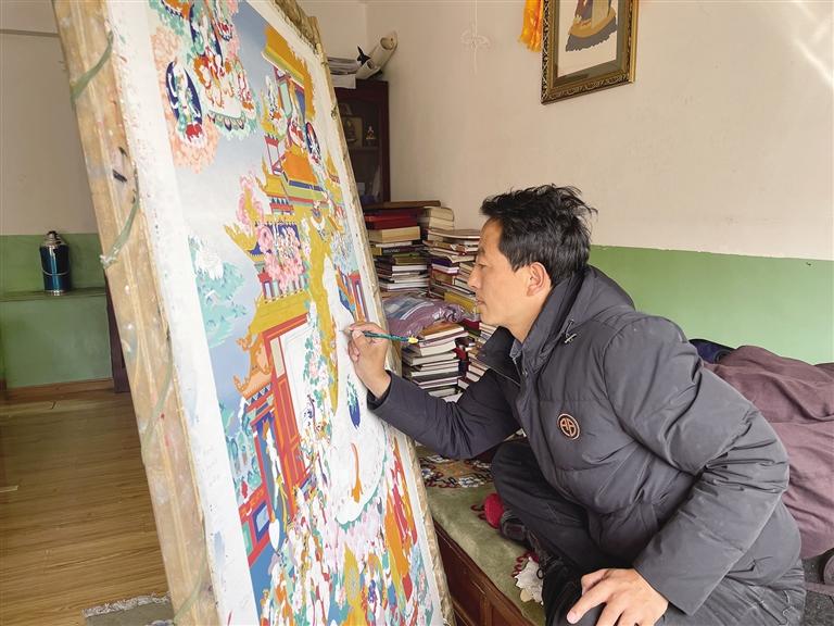 貢覺杰正在創(chuàng)作唐卡。