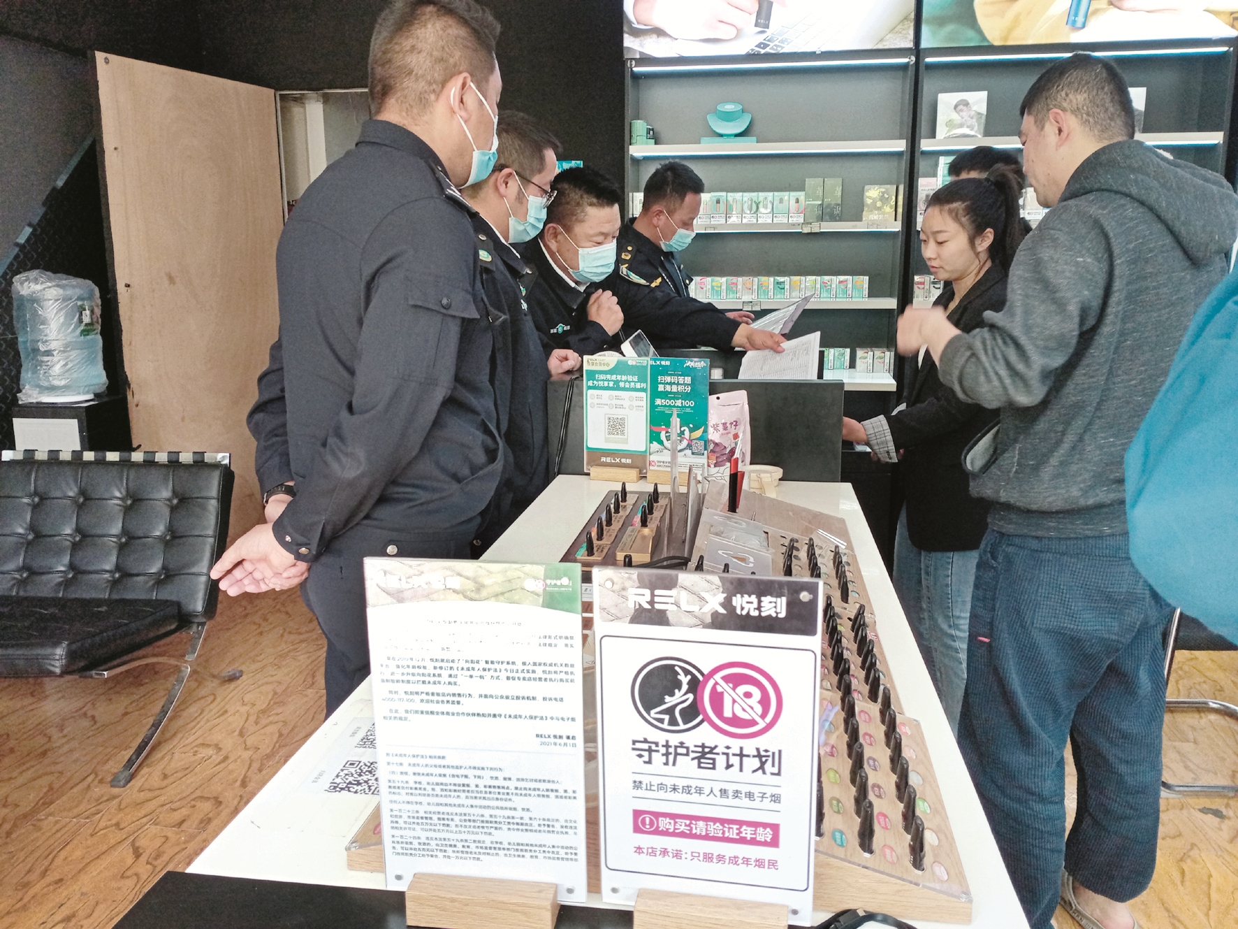 4月25日上午,市公安局和市煙草專賣局等四部門工作人員在柳梧新區(qū)聯(lián)合開展了電子煙銷售網(wǎng)點(diǎn)檢查。每到一個電子煙銷售網(wǎng)點(diǎn),執(zhí)法人員會詳細(xì)查看銷售網(wǎng)點(diǎn)是否具有相關(guān)經(jīng)營資質(zhì)、是否設(shè)立不得向未成年人售賣電子煙警示標(biāo)志以及身份證件核驗等規(guī)定落實情況,并向電子煙經(jīng)營者進(jìn)行相關(guān)法律法規(guī)宣傳,告知經(jīng)營者嚴(yán)禁向未成年人銷售電子煙。