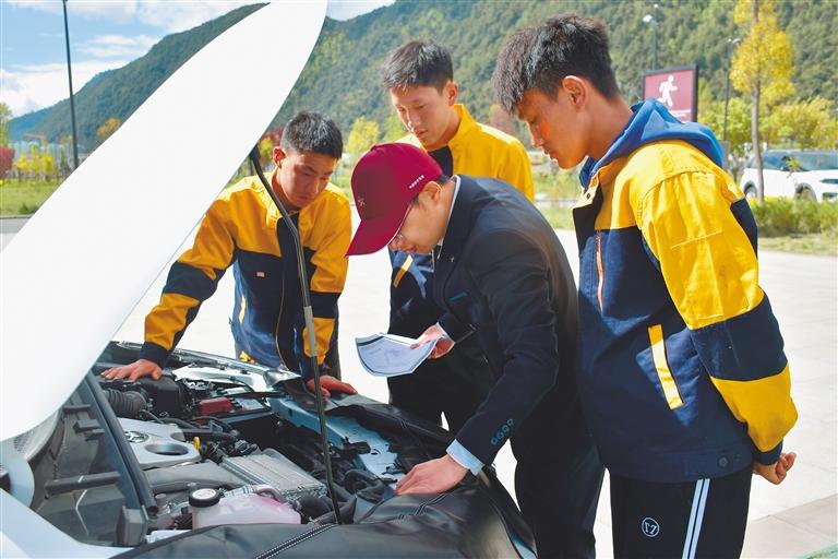汽修班的老師和學(xué)生現(xiàn)場演示如何排除汽車故障。