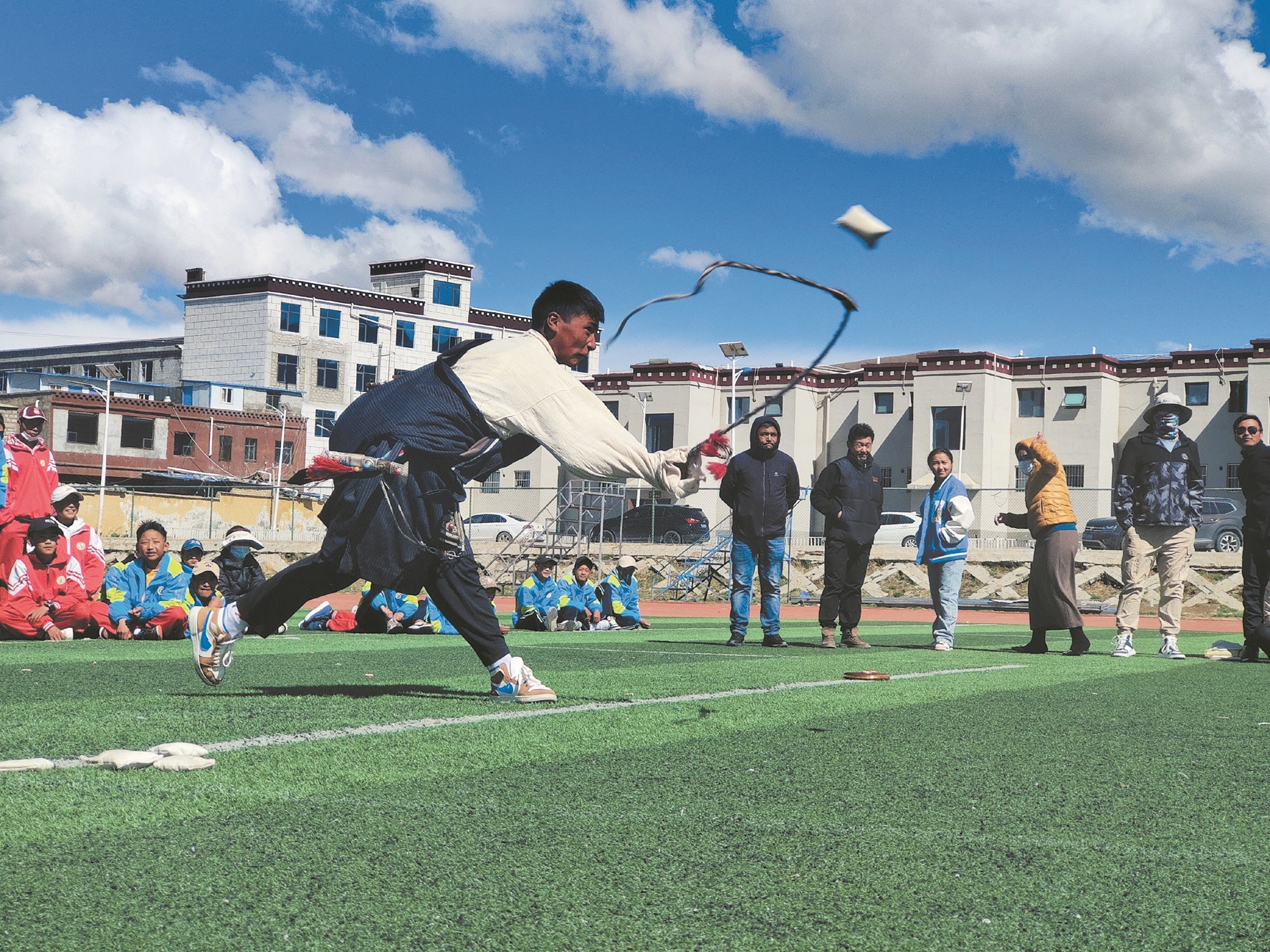 活動中,來自全縣中小學和幼兒園的學生分別參加了藏漢文書法、朗讀、歌舞、寫作、繪畫等比賽以及羊拐、“吾多”等傳統(tǒng)競技項目。比賽中學生們熱情激昂、各展身手,一個個朝氣蓬勃的身影、一件件獨具特色的作品,展現(xiàn)著牧區(qū)兒女拼搏上進的精神風貌。“我在家放羊的時候經(jīng)常用‘吾多’,沒想到今天能有展示這個技能的機會,非常高興?!薄拔岫唷眳①愡x手白瑪頓旦說。