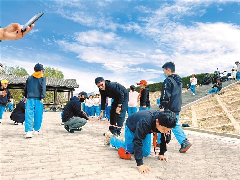 圖為拉薩市第一小學學生們在老師的帶領(lǐng)下開展戶外活動。