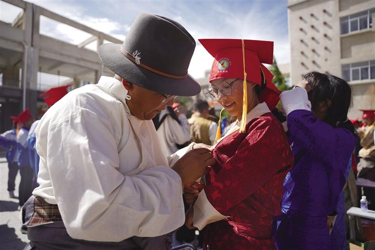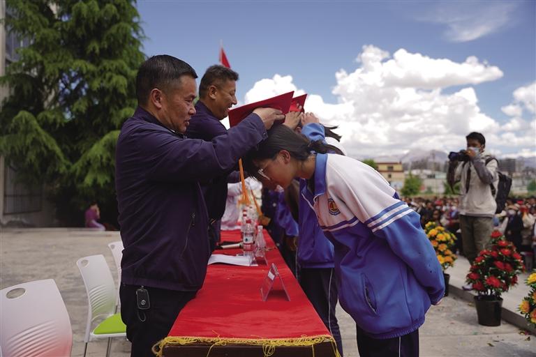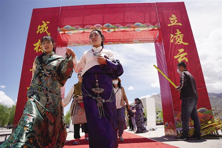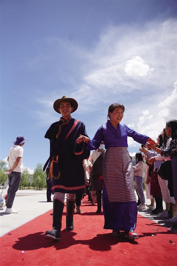 走進(jìn)拉薩市第四高級中學(xué),校園里每個角落都流露出喜悅與溫馨,同學(xué)們身著色彩鮮艷的民族傳統(tǒng)服裝,帶著自信的笑容,在父母與老師的陪伴下,走過“成人門”,踏上“成才路”,通向“成功門”。此時的他們意氣風(fēng)發(fā),青春的面龐如同朝陽一般閃爍著光芒,滿懷豪情地憧憬精彩的人生。高三學(xué)生朗色占堆告訴記者:“今天是特別值得紀(jì)念的日子,以后我們都是成年人了,會勇于承擔(dān)責(zé)任,對自己的行為負(fù)責(zé),努力成為一個有知識、知感恩、有責(zé)任、有擔(dān)當(dāng)?shù)男聲r代新青年?!?/p>