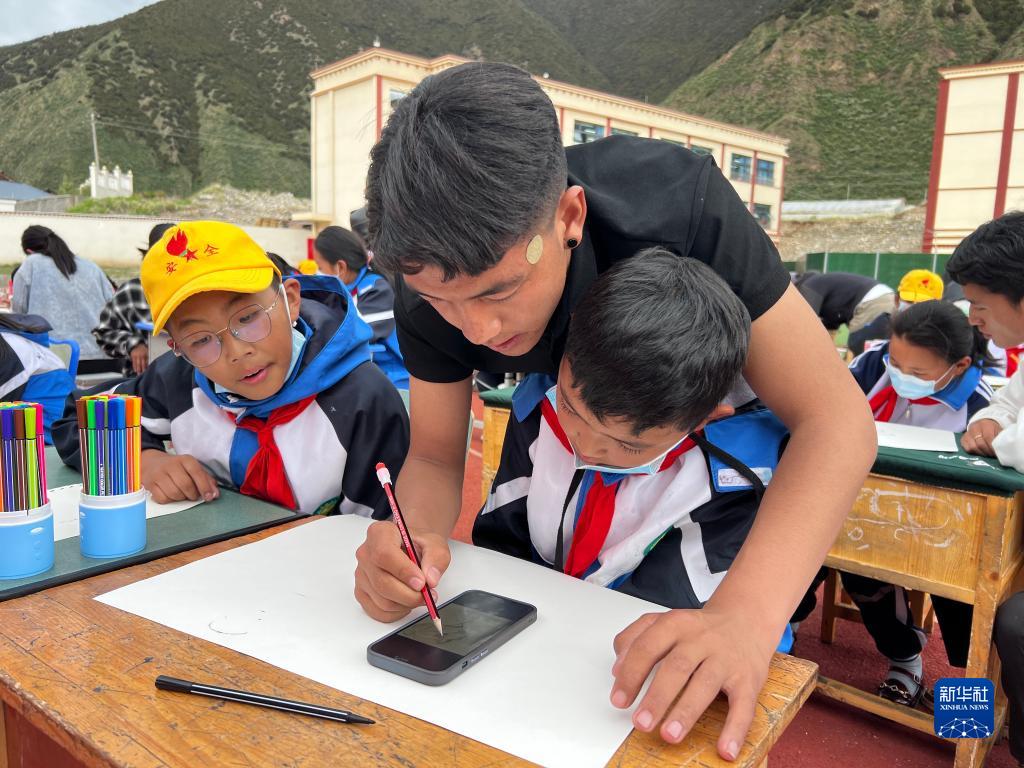 西藏大學(xué)美術(shù)專業(yè)學(xué)生為工布江達縣小學(xué)孩子們輔導(dǎo)繪畫。(受訪者供圖)
