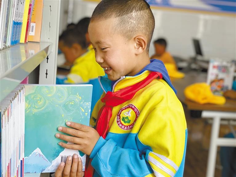 在蘇州援建的蘇萱圖書室內(nèi),林周縣蘇州小學學生正在挑選自己喜歡的讀物。
