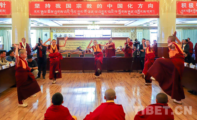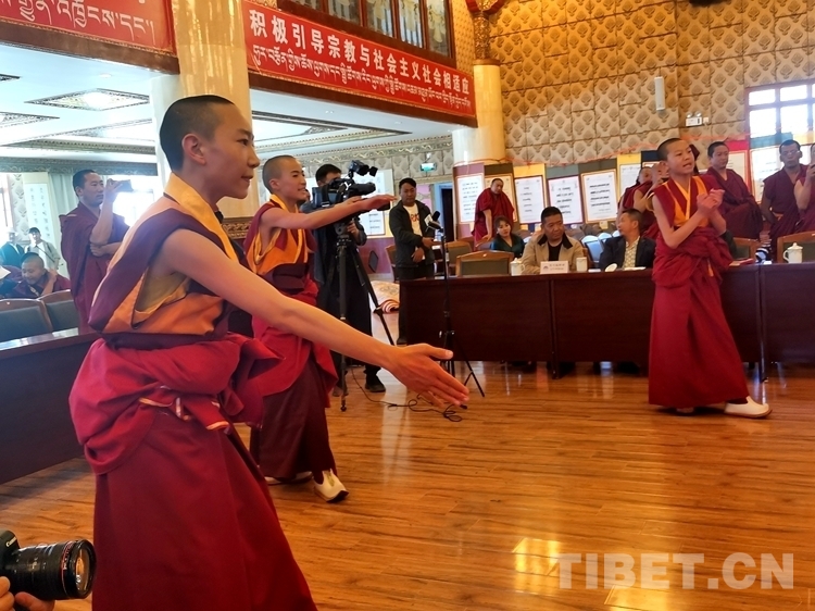 據(jù)了解,與傳統(tǒng)寺廟教育相比,西藏佛學(xué)院開設(shè)有文化課和佛學(xué)兩大體系,天資聰慧的少年活佛們?cè)谛F陂g已經(jīng)開始研習(xí)含義深刻、博大精深的《五部大論》《入菩薩行論》等佛教經(jīng)典作品,目前已經(jīng)可以流暢地背誦部分經(jīng)典。在當(dāng)日的學(xué)習(xí)成果匯報(bào)展示會(huì)上,少年活佛們不僅展示了藏漢雙語(yǔ)朗誦、藏漢文書法、英語(yǔ)情景劇等,也為大家?guī)?lái)了《入菩薩行論》第一章的背誦展示和辯經(jīng)展示。