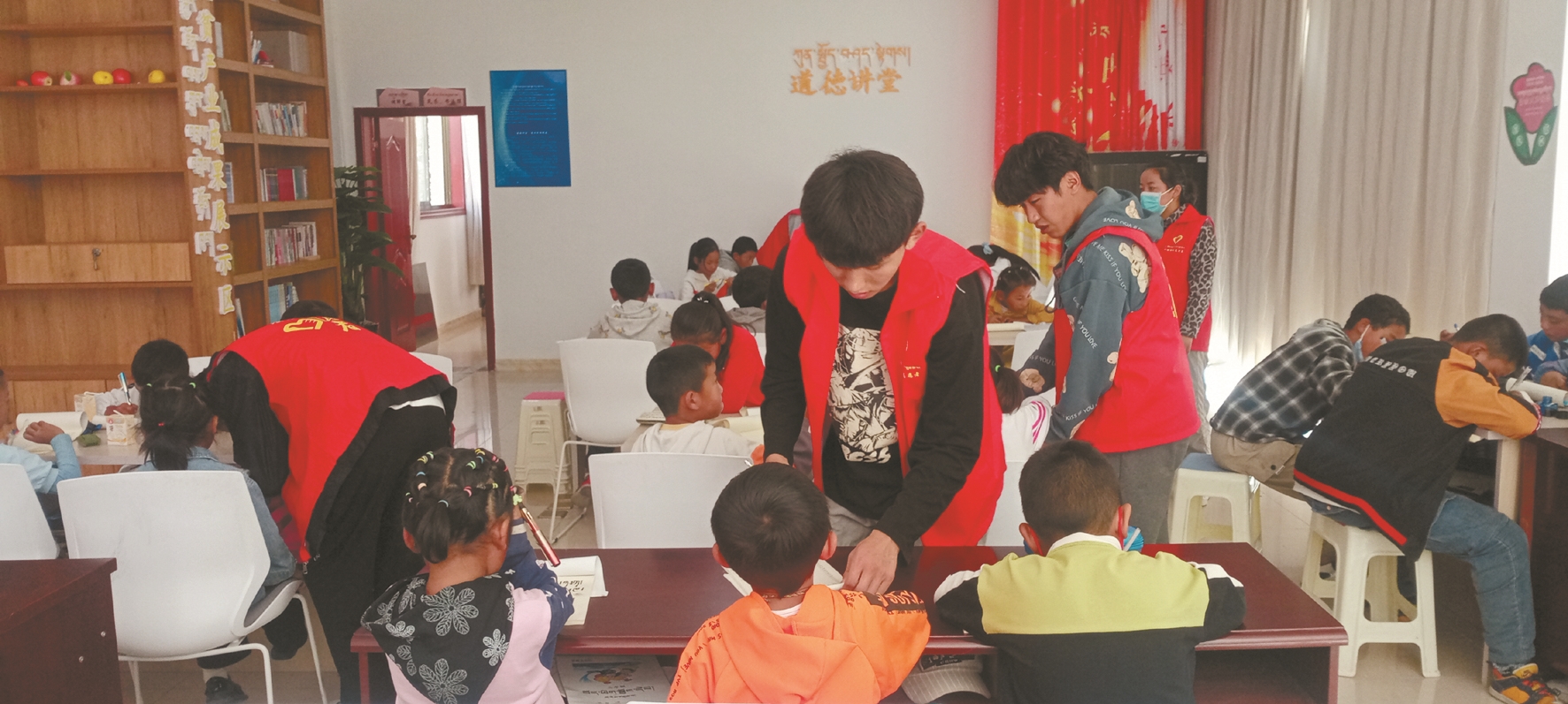 圖為7月25日,桑達村大學(xué)生為孩子們提供作業(yè)輔導(dǎo)、日間托管服務(wù)。 拉薩融媒記者 齊永昌攝