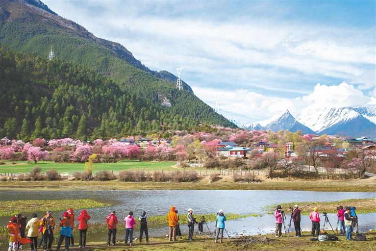 旅游業(yè)快速發(fā)展,全區(qū)旅游接待人數(shù)和旅游總收入分別由2012年的1058萬人、126.47億元增加至2021年的4153萬人、441.90億元。圖為2021年4月西藏自治區(qū)林芝市桃花節(jié)迎來國內(nèi)外游客。