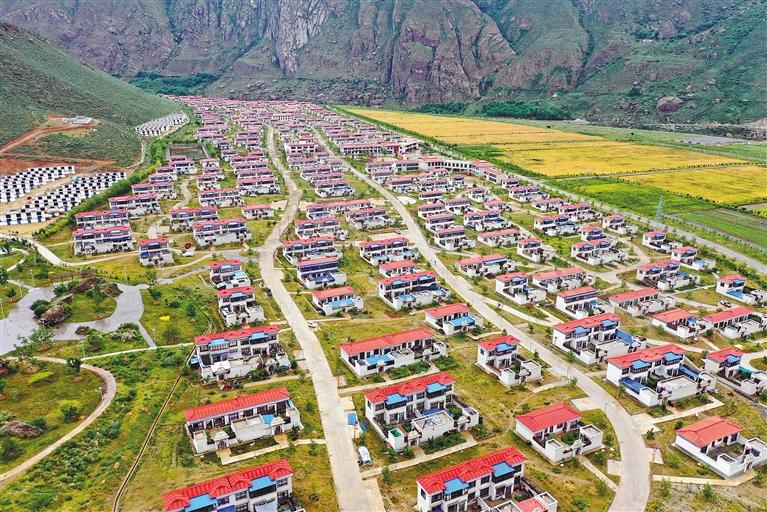 易地搬遷脫貧一批。2016年以來,累計投入198億元,建成964個易地扶貧搬遷安置點,26.6萬人搬遷入住。圖為西藏自治區(qū)加查縣共康村易地扶貧搬遷點。