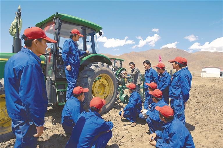 發(fā)展教育脫貧一批。2016年以來,累計落實義務(wù)教育學(xué)?;窘ㄔO(shè)資金84.4億元,實施教育基礎(chǔ)建設(shè)項目1433個,資助建檔立卡和農(nóng)村低保大學(xué)生累計6.06萬人次,落實資助資金3.55億元。圖為西藏自治區(qū)白朗縣邀請山東農(nóng)機技師對當(dāng)?shù)刎毨糸_展培訓(xùn)。
