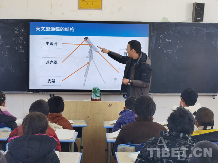 11月30日,王建煜受邀來(lái)到海拔4300多米的騾子溝小學(xué),帶著天文設(shè)備為牧區(qū)孩子們上了一節(jié)望遠(yuǎn)鏡觀測(cè)入門(mén)課。王建煜通過(guò)PPT展示了豐富的天文社團(tuán)活動(dòng),引起了孩子們強(qiáng)烈的好奇心和探索心。他介紹到,要想觀測(cè)到遙遠(yuǎn)的地方,必須要借助工具,而天文望遠(yuǎn)鏡,就是我們觀測(cè)星空的工具。