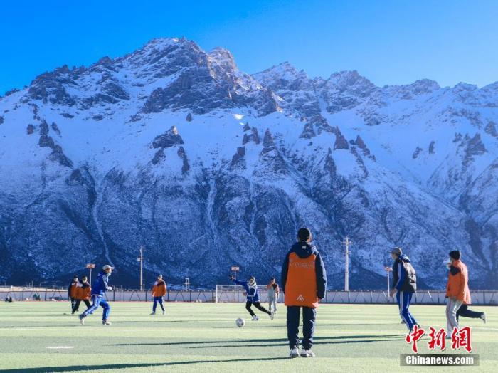 圖為11月25日,西藏那曲市嘉黎縣中學(xué)學(xué)生們?cè)凇把┥较碌膲?mèng)幻足球場(chǎng)”上踢足球比賽。 中新社記者 貢嘎來(lái)松 攝