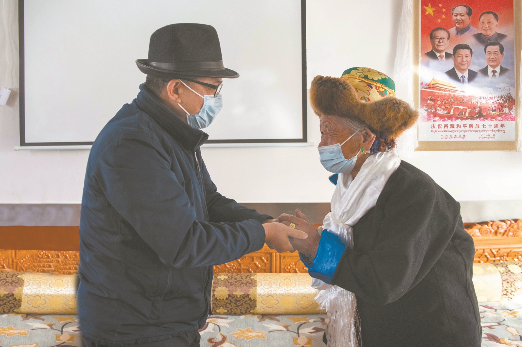 藏歷新年臨近,城關(guān)區(qū)特困人員集中供養(yǎng)中心內(nèi)暖意融融,在工作人員的悉心照料下,老人們幸福地安享晚年生活?!靶履昕鞓?、扎西德勒”,帶著黨和政府的關(guān)懷與溫暖,王強為老人們敬獻哈達,致以節(jié)日美好祝福,關(guān)切地詢問老人們的飲食起居和身體狀況,語重心長地告訴大家黨的光輝照邊疆,要飲水思源,聽黨話、感黨恩、跟黨走,保重身體、樂享晚年。