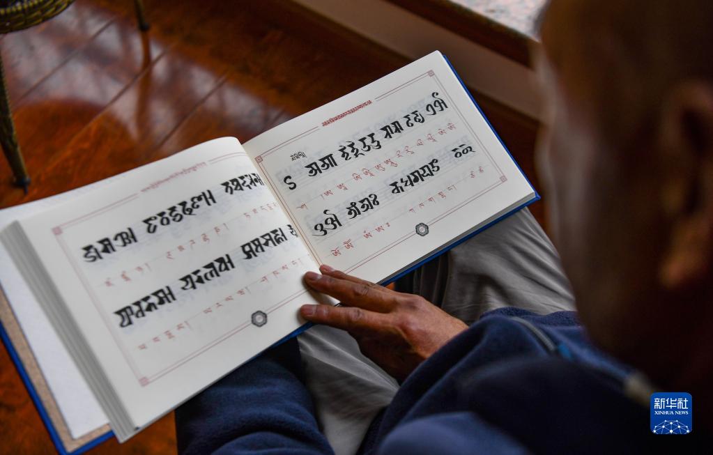 久米次成查閱梵文藏文對照工具書(4月19日攝)。新華社記者 晉美多吉 攝