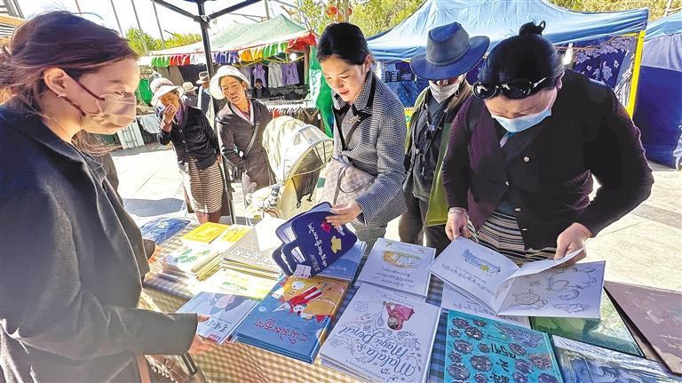 圖為市民群眾在活動(dòng)現(xiàn)場(chǎng)選購(gòu)青年創(chuàng)業(yè)者文創(chuàng)產(chǎn)品——早教啟蒙讀物。記者 格桑倫珠 攝