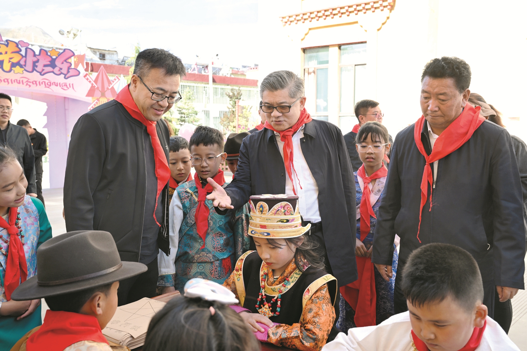 拉薩市第一小學(xué)是西藏和平解放后拉薩開辦的第一所公立小學(xué),建校70年來,為新西藏各項(xiàng)建設(shè)事業(yè)輸送了萬千棟梁人才。來到拉薩市第一小學(xué)江蘇路分校,身著民族服飾的藏族小姑娘南杰拉措為王強(qiáng)一行系上鮮艷的紅領(lǐng)巾,并熱情帶領(lǐng)王強(qiáng)一行走向校園。