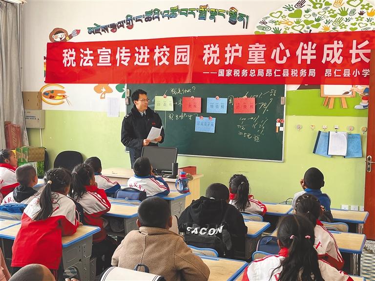 圖為國家稅務總局昂仁縣稅務局稅宣小隊的稅務干部為學生講解稅法知識。記者 楊小娟 攝