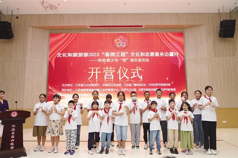 儀式上,江蘇和拉薩兩地青少年圍繞“中華民族一家親,同心共筑中國(guó)夢(mèng)”主題開(kāi)展了互助結(jié)對(duì)儀式和“春雨工程”授旗儀式,范躍平和陳兵共同將文旅部“春雨工程”項(xiàng)目旗幟授給本次活動(dòng)項(xiàng)目領(lǐng)隊(duì)、拉薩市圖書(shū)館館長(zhǎng)朱純琳。