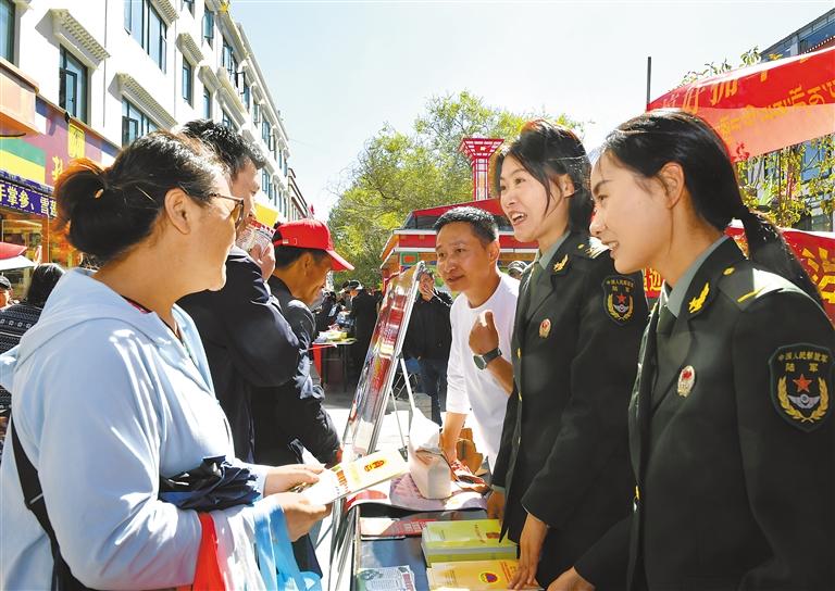 圖為9月16日上午,相關單位工作人員在拉薩宇拓路街頭為過往群眾講解國防安全知識。記者 旦增蘭澤 攝