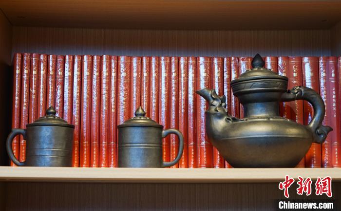 圖為中心書架上擺放的藏族黑陶工藝品。馬銘言攝
