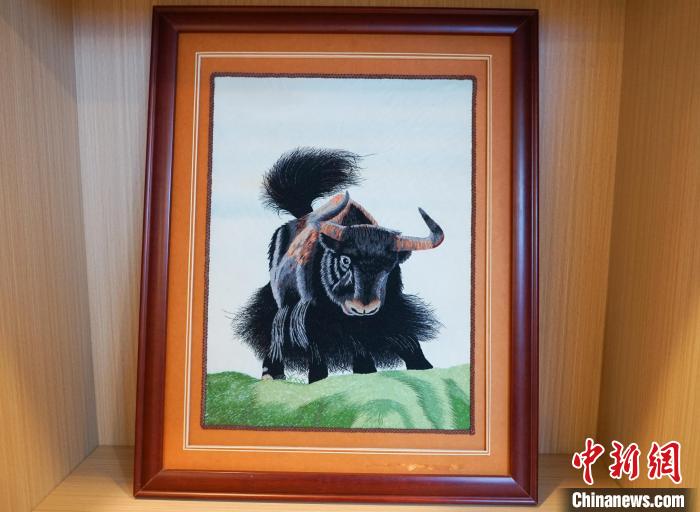 墻上懸掛的青海省民族團(tuán)結(jié)進(jìn)步形象標(biāo)識(shí),由多種少數(shù)民族刺繡共同制作而成;撒拉族婦女純手工制作的黃河石藝畫色調(diào)古雅、未經(jīng)雕琢,畫面呈現(xiàn)天然立體感,意境悠遠(yuǎn)朦朧。