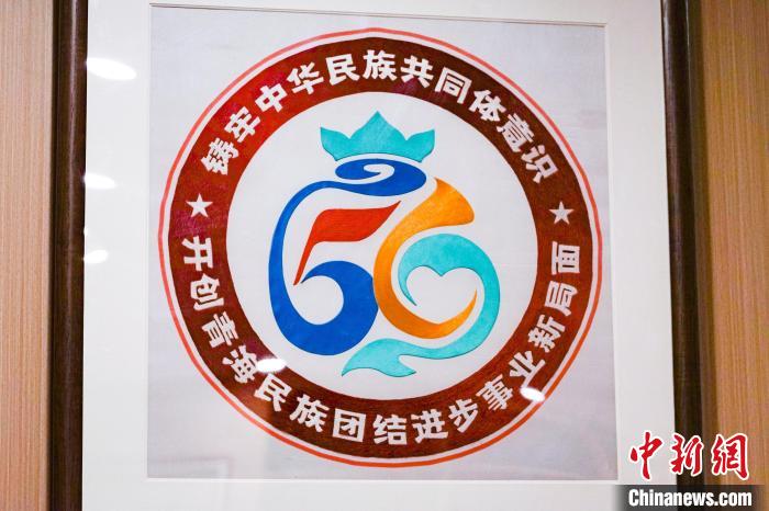 圖為中心內(nèi)展示的青海省民族團(tuán)結(jié)進(jìn)步形象標(biāo)識(shí)刺繡作品。馬銘言 攝