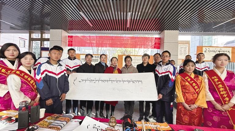 隨后,與會領(lǐng)導向江蘇實驗中學贈送了150套民族團結(jié)進步教育讀本。大家一同觀看了書畫社同學現(xiàn)場進行的民族團結(jié)進步書畫作品創(chuàng)作。中國書協(xié)會員、自治區(qū)政協(xié)委員、拉薩市政協(xié)常委、區(qū)市書協(xié)副主席南杰旺扎現(xiàn)場創(chuàng)作了“鑄牢中華民族共同體意識”的藏文書法橫幅贈送給江蘇實驗中學。
