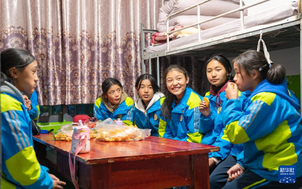 斯曲卓瑪(右三)和同宿舍的朋友一起吃零食聊天(11月9日攝)。新華社發(fā)(丁增尼達(dá) 攝)